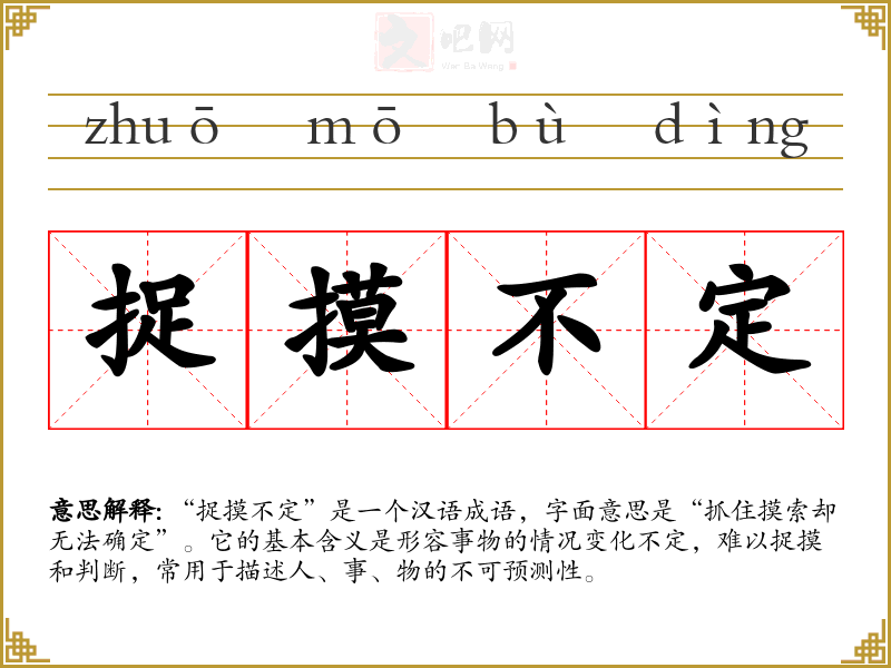 “捉摸不定”是一个汉语成语,字面意思是“抓住摸索却无法确定”。它的基本含义是形容事物的情况变化不定,难以捉摸和判断,常用于描述人、事、物的不可预测性。