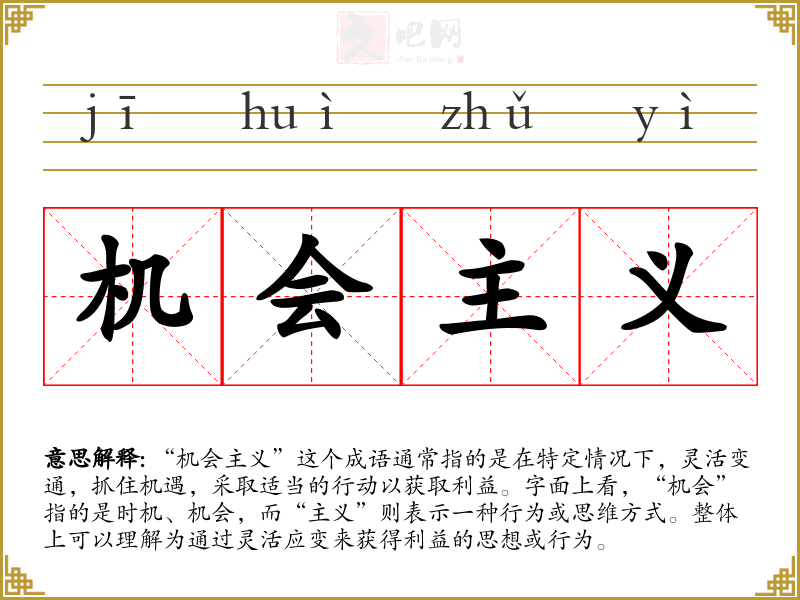 “机会主义”这个成语通常指的是在特定情况下,灵活变通,抓住机遇,采取适当的行动以获取利益。字面上看,“机会”指的是时机、机会,而“主义”则表示一种行为或思维方式。整体上可以理解为通过灵活应变来获得利益的思想或行为。