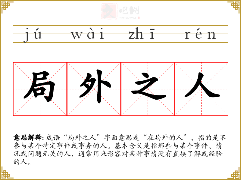 成语“局外之人”字面意思是“在局外的人”,指的是不参与某个特定或事务的人。基本含义是指那些与某个、情况或问题无关的人,通常用来形容对某种事情没有直接了解或经验的人。
